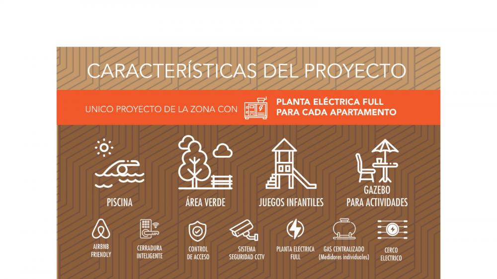 • Área servicio• Balcón• Gas Común• Gazzebo• Intercom• Planta eléctrica• Piscina• Portón eléctrico• Vigilancia• Walk in closet